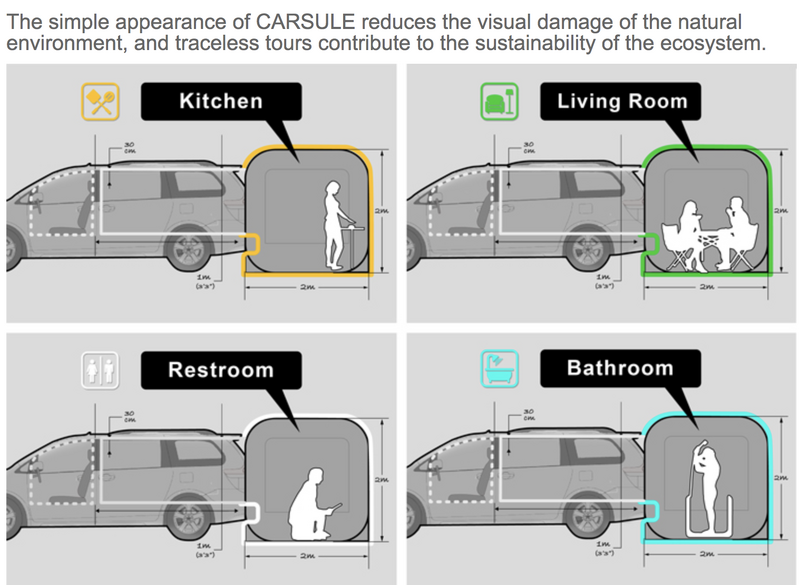 Unlike most tents that is only meant for sleeping, CARSULE provides you with a living room in the outdoors, and offers mobility since the simple installation makes the movement possible and easy. Initially, coming up with a pop-up space of 2 meter height is a design challenge, but after many trials and errors, it is finally resolved and translated into reality.