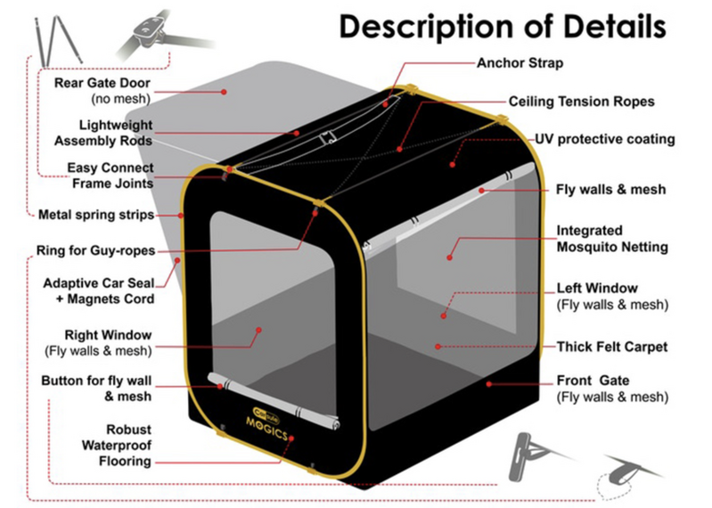 - Accessory Pack: Ceiling tension ropes*1(2 pcs)?Guy-ropes*4?Screw-in peg*4?Neodymium Magnets, magnet cord*2