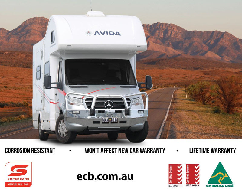 For the ultimate in frontal protection you can't go past the superior strength, quality and style of the ECB Big Tube Bar® for your Mercedes-Benz Sprinter Front Wheel Drive model. The single piece channel is fully welded and manufactured from hi-tensile, structural grade alloy to provide maximum protection. Our Big Tube Bar® incorporates a full width, braced lower protection skirt and the specifically designed steel mounting system ensures a strong and sturdy fit. ECB LED light combinations, bumper lights, air directional cooling vents and an aerial bracket are all standard features.