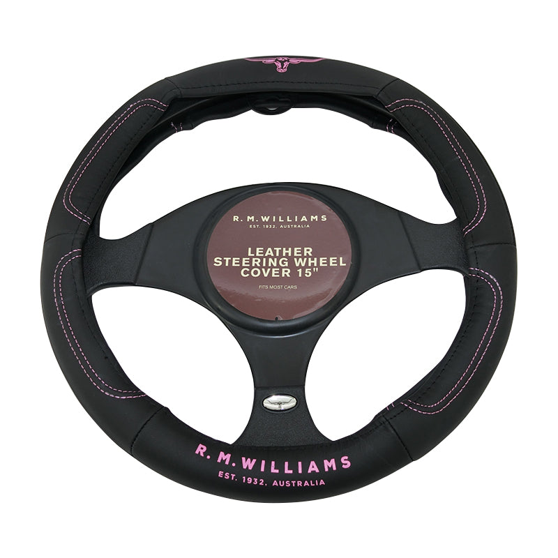 RM Williams Steering Wheel Cover 15 Inch 38cm Leather Jillaroo Pink Logo