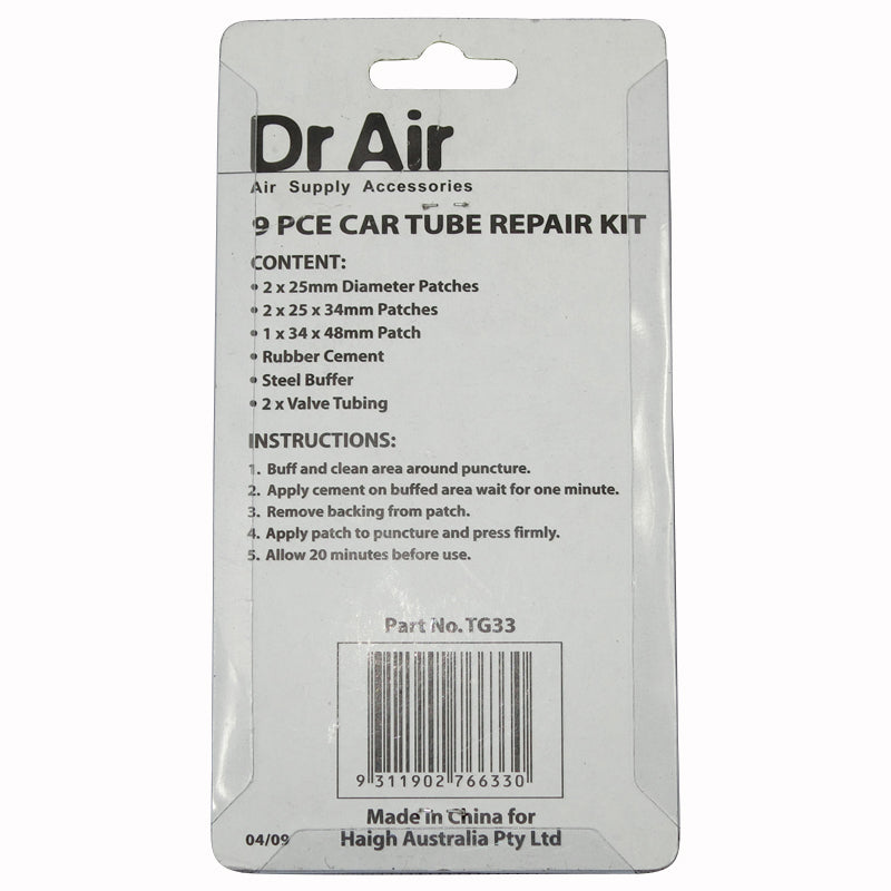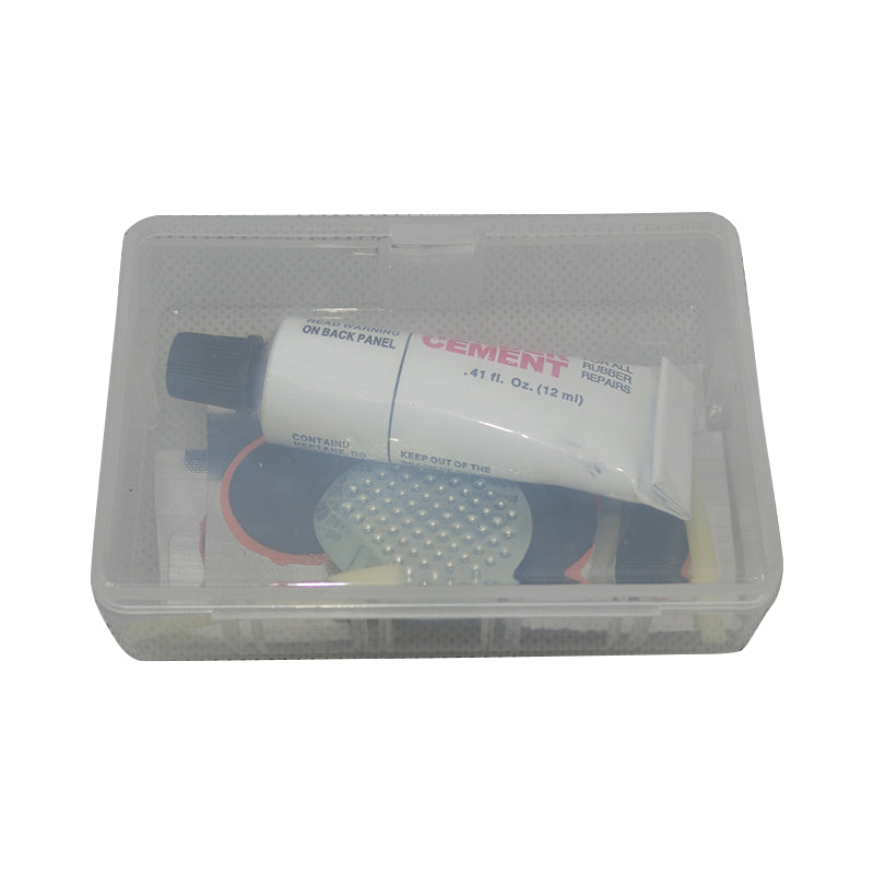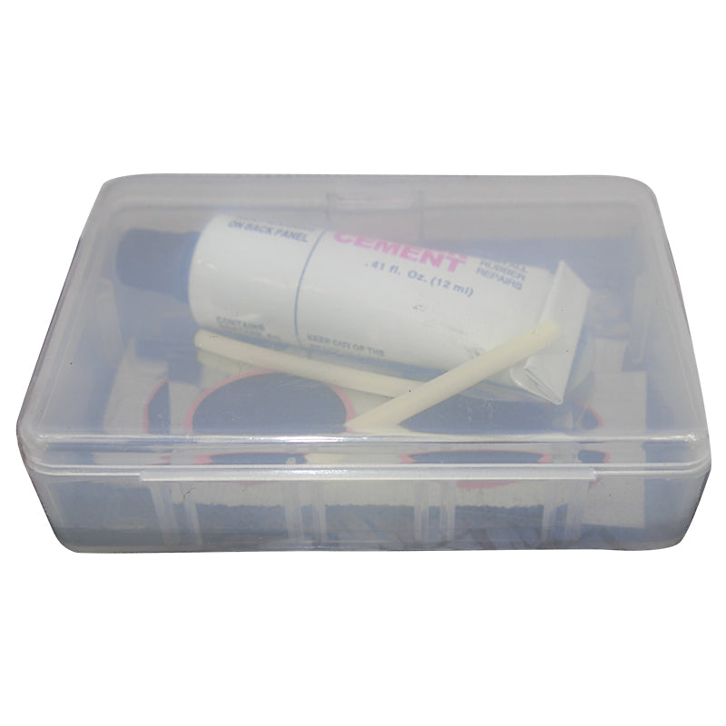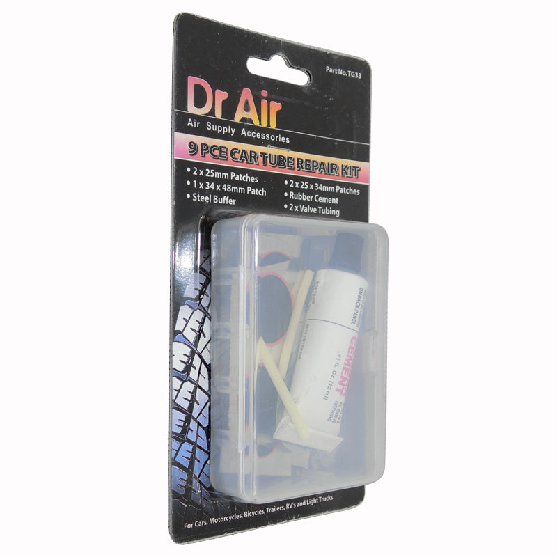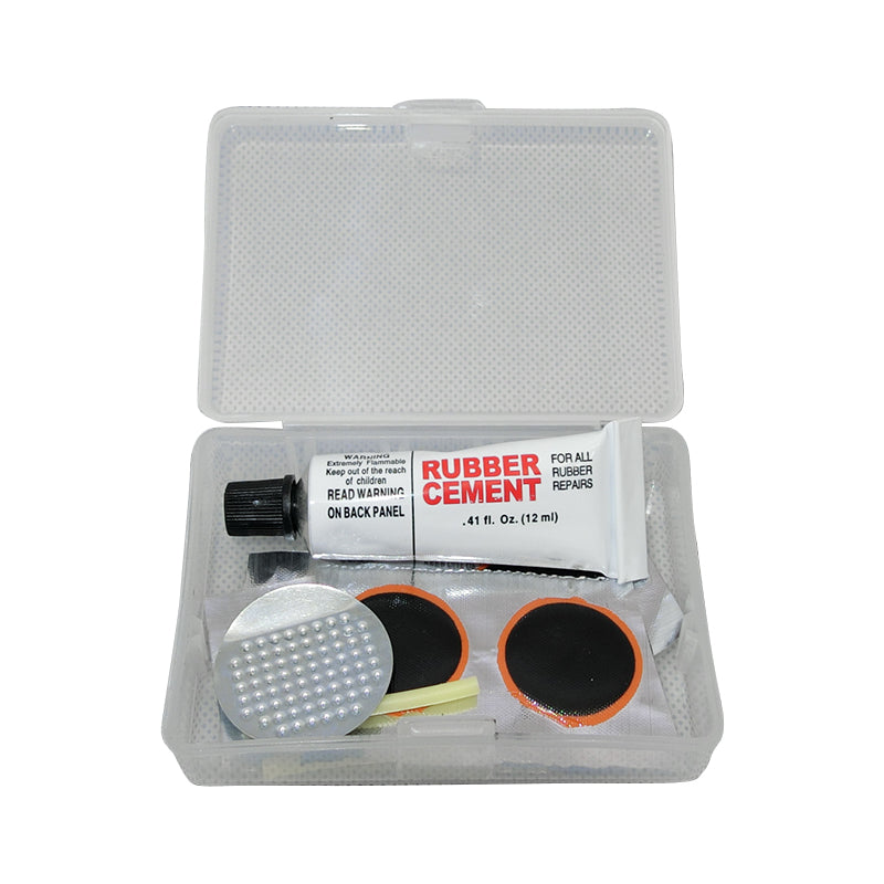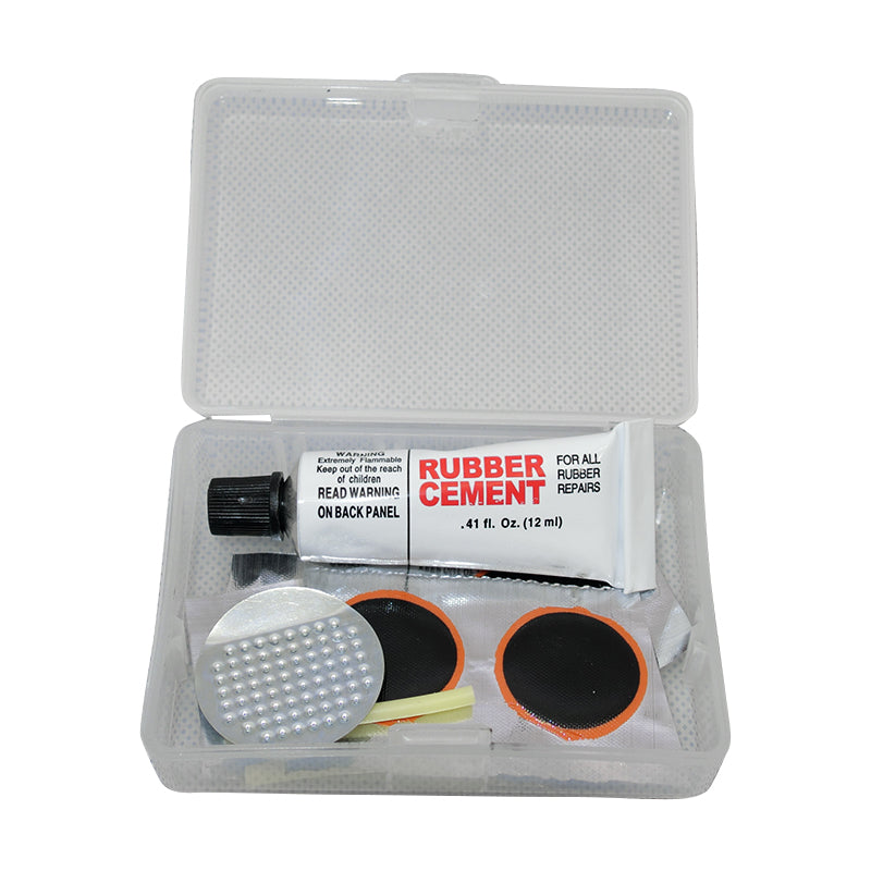Kit includes a tube of rubber glue, rubber repair patches, a tyre preparation tool.